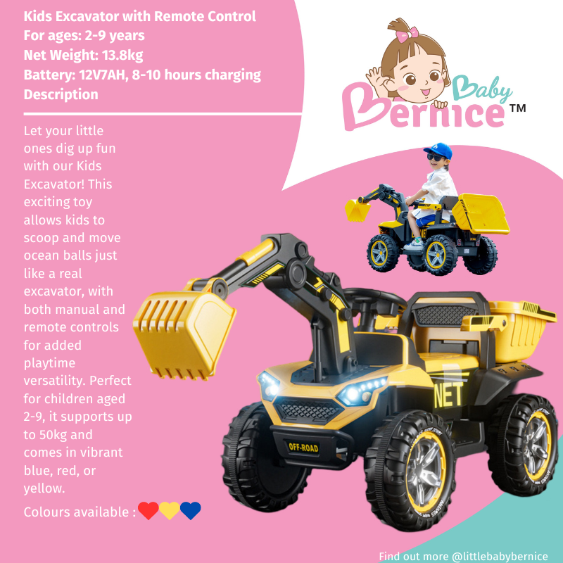 Introducing our Kids Excavator, designed to bring joy and adventure to playtime! Equipped to handle a 50kg load, this excavator can dig and drop ocean balls with ease. It features manual controls for hands-on fun and a remote for easy operation from a distance. The 12V7AH battery charges in 8-10 hours and can link to your phone to play music while your child plays.