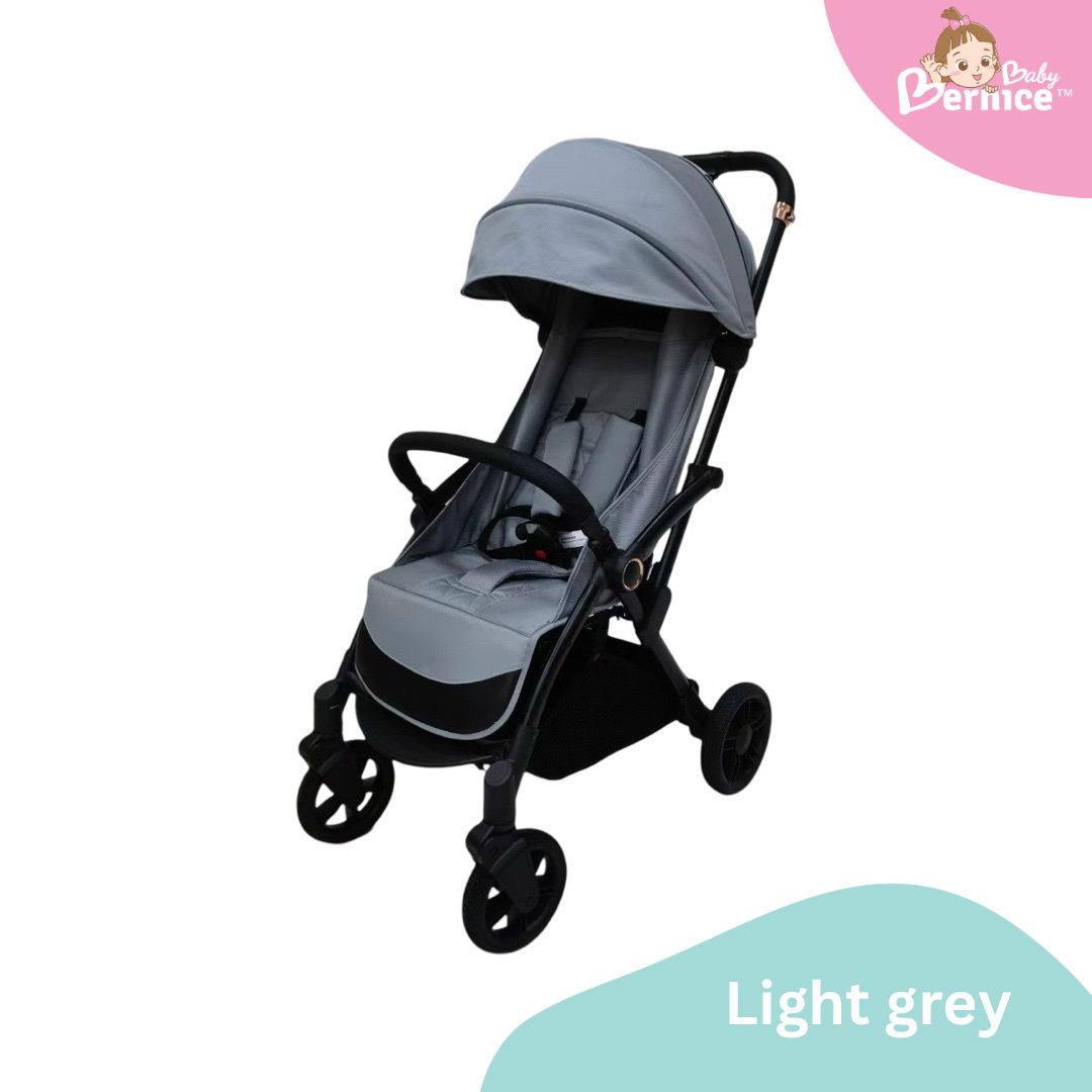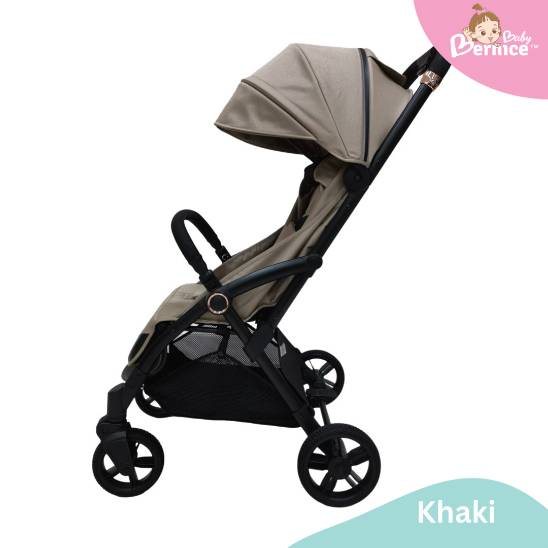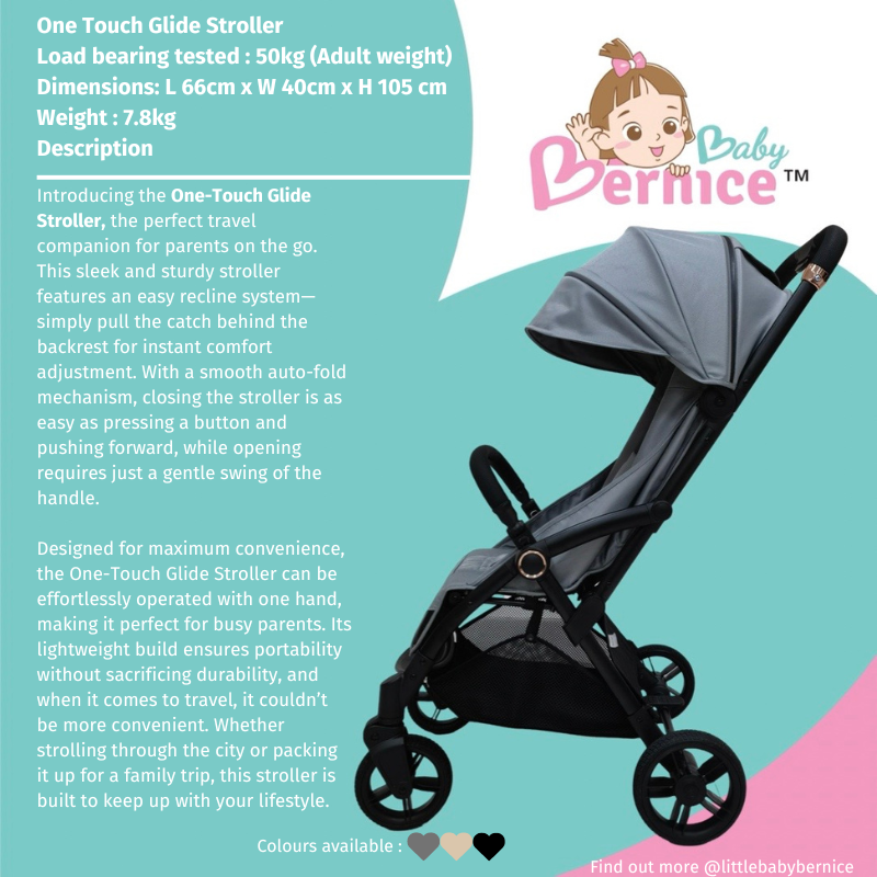 Introducing the One-Touch Glide Stroller, the perfect travel companion for parents on the go. Available in **light grey, khaki, and black**, this sleek and sturdy stroller features an easy recline system—simply pull the catch behind the backrest for instant comfort adjustment. With a smooth auto-fold mechanism, closing the stroller is as easy as pressing a button and pushing forward, while opening requires just a gentle swing of the handle.